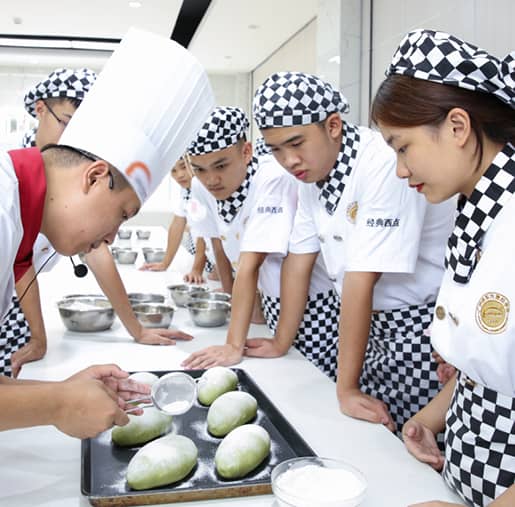 焦糖玛德琳、布朗尼、黑森林蛋糕等常温蛋糕学习、 千层酥、三角果酱酥等饼干类、面包基本功、软质面包制 作、月饼等中式点心。